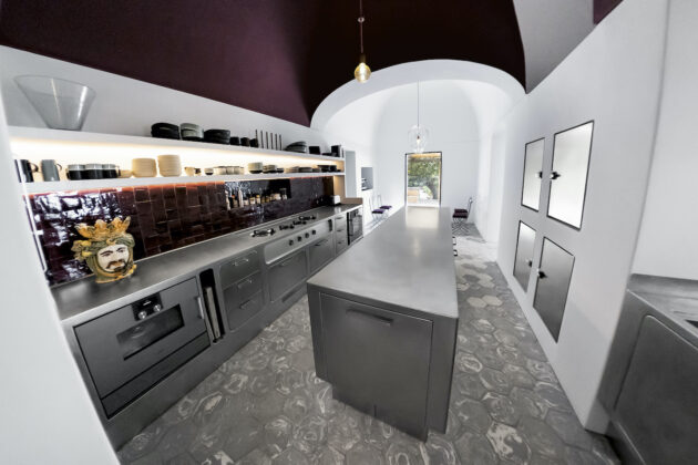 The glazed majolica tiles act as a backrest and as a decorative element. The module that houses the washing area is housed in the other long wall: it has two dishwashers (one of which is professional) and is flanked by the steel cup holder, designed by Abimis. In the center of the room, there is an island of considerable size, equipped with various storage compartments. The kitchen project is completed by a piece of furniture “in niche” with glass shelves in the upper part.