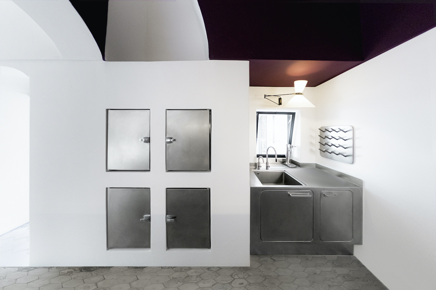 In this project, the area dedicated to the conservation of food and drinks combines functional effectiveness with a solution characterized by essentiality in terms of aesthetics. In fact, four doors built into the wall opposite to the one dedicated to cooking, “hide” the professional refrigerators, offering adequate storage space and, at the same time, maintaining a clean, linear style.